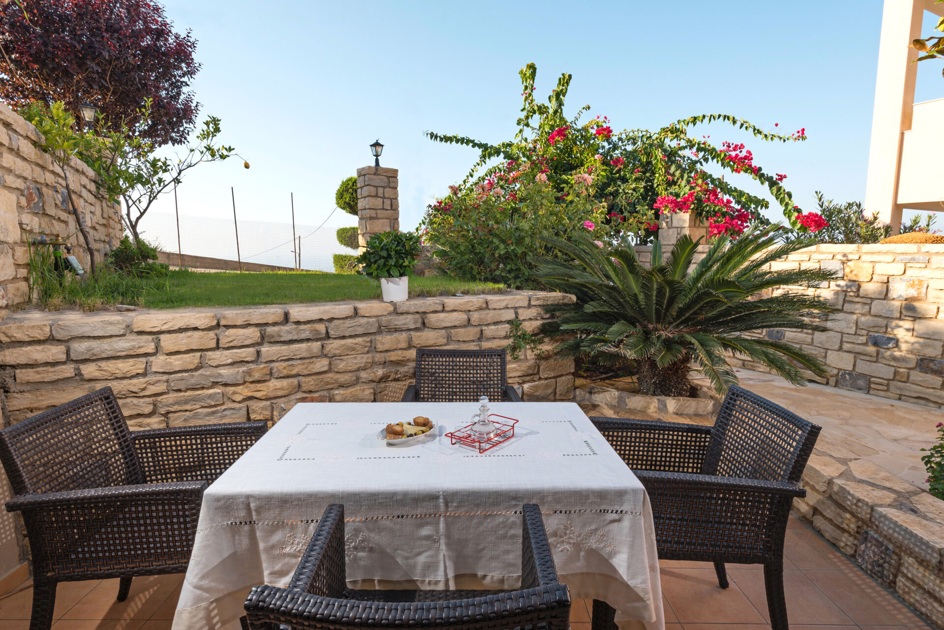 Villa Bougainvillea can accommodate 4 to 5 people, offering 2 bedrooms and 1 bathroom. The kitchen, dining and living room are in an open space room, from where you can cherish the colours and smell the scent of the garden and the sea.
